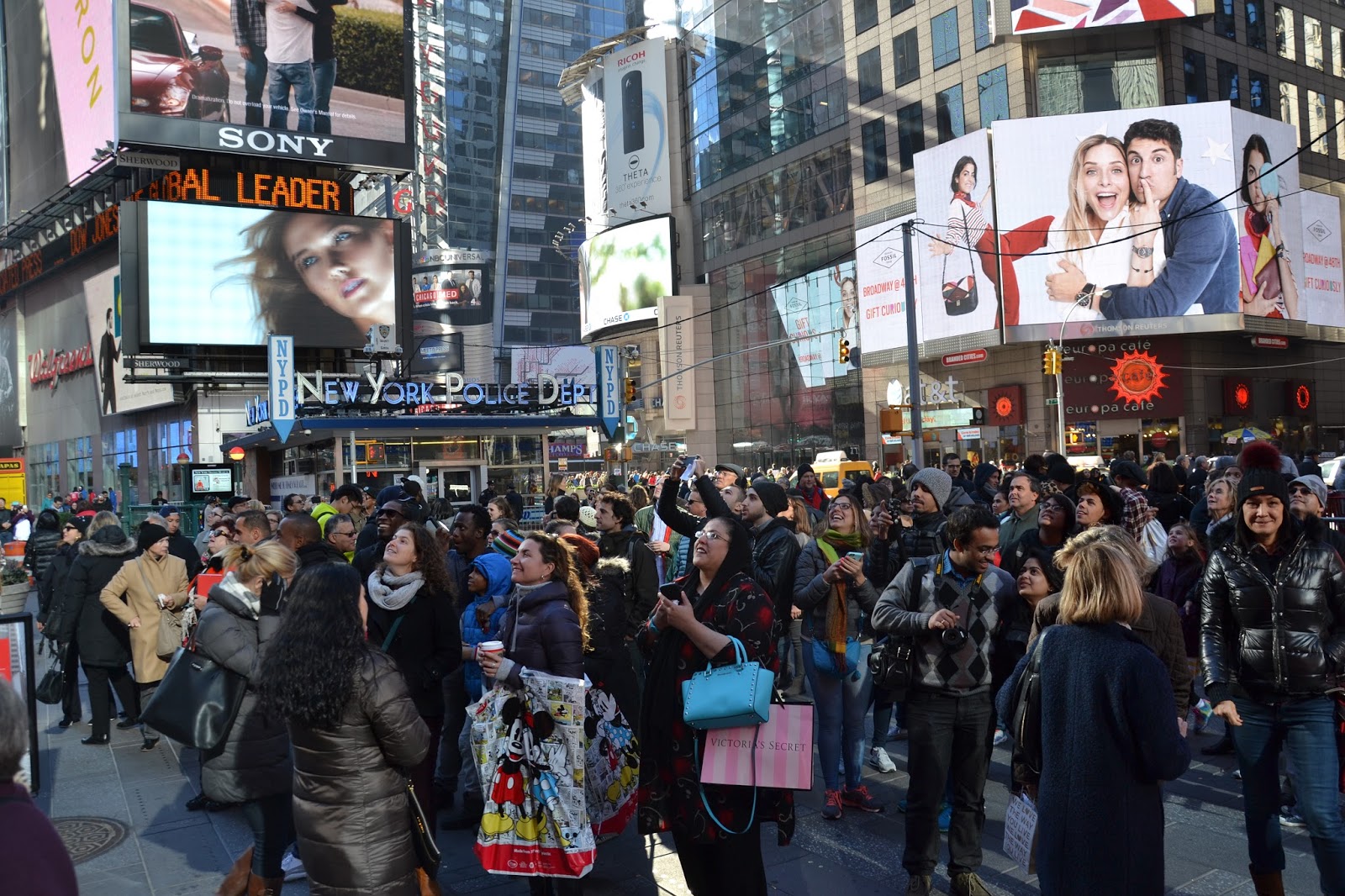tTimes Square is really a pedestrian mall - but people hang about. Snack. People watch. Pause. But a lot of coming and going happens here...