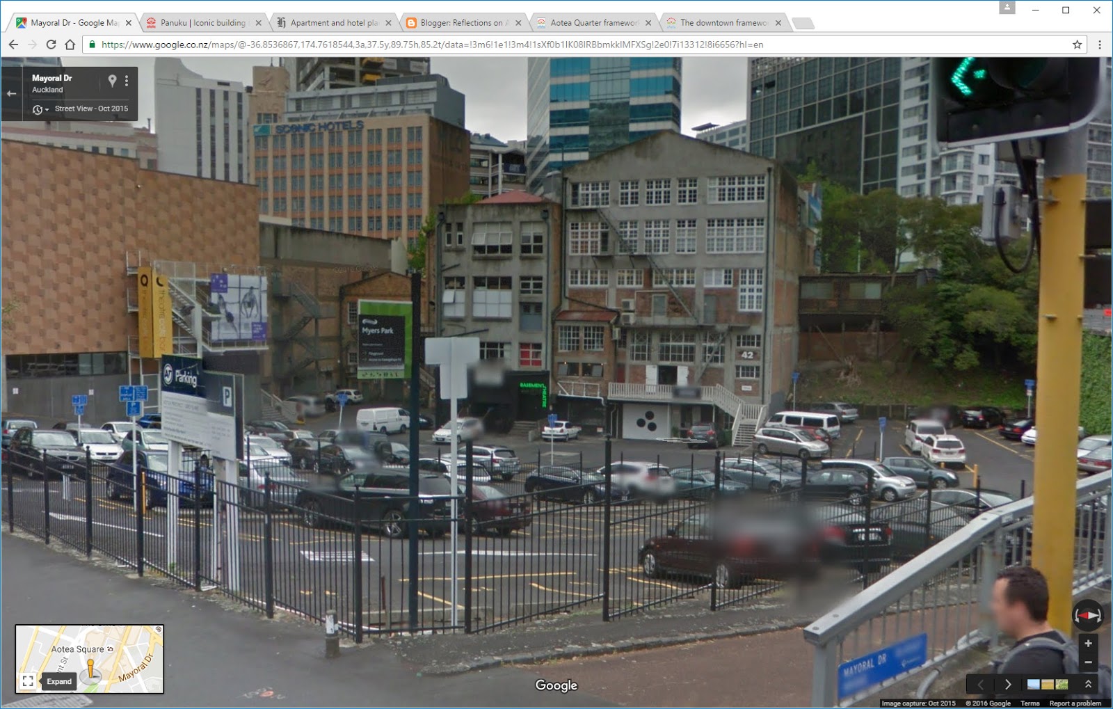 This streetview image looks North along Grey's Ave toward the Aotea Carpark entry. The Civic Admin Building is to the left, the proposed redevelopment of one of the pink developable sites in the map named "Civic Admin Building", will align with the west edge of Grey's Ave shown here to the corner with Mayoral Drive. From this point of view the proposed new apartment building would block the view of the Civic Admin Building (no bad thing some might say). But there's more to it. Across Grey's Ave from the proposed development is the Victorian remnant of this part of CBD.